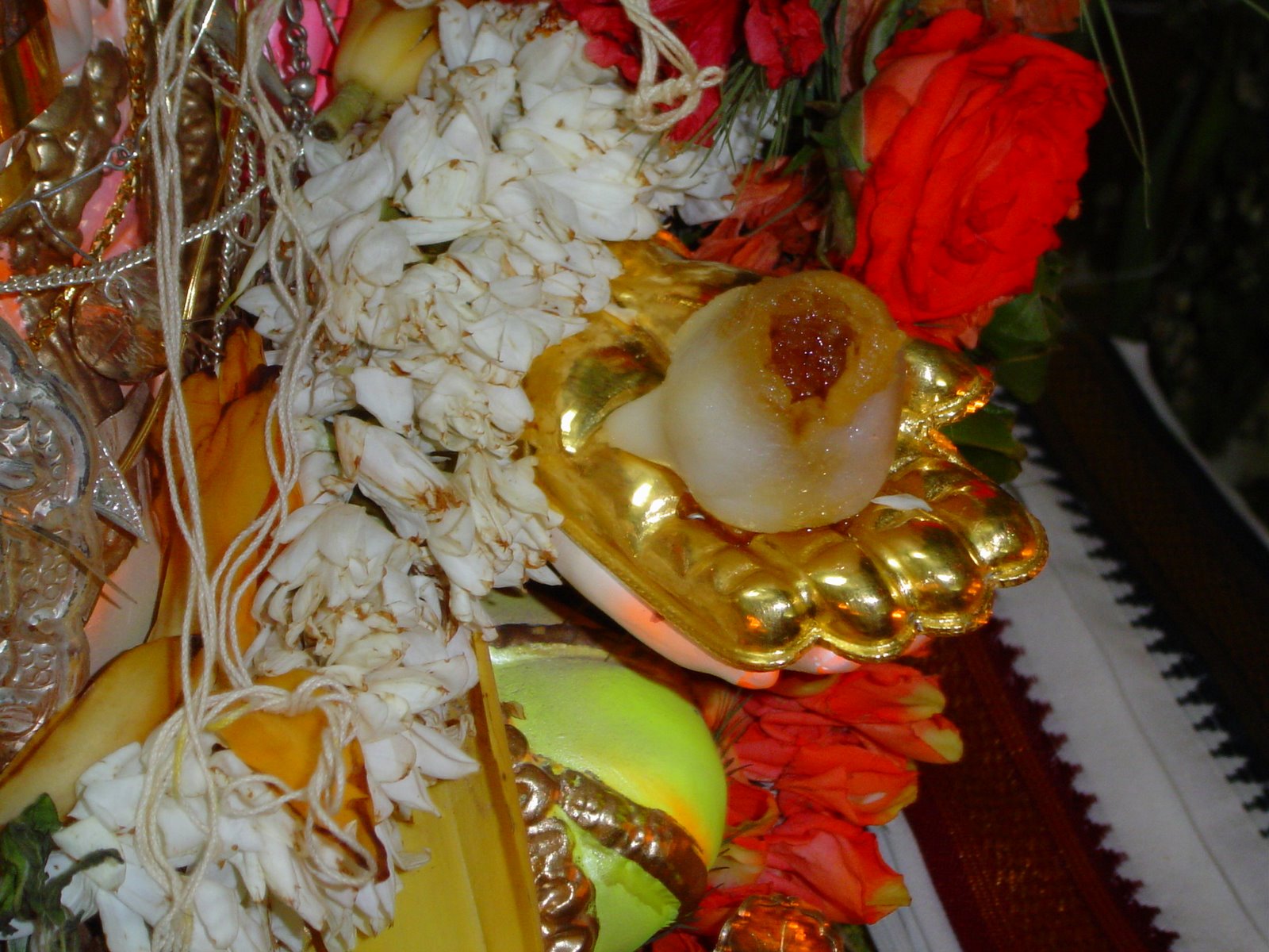 Radhika’s friend from office, a Ganesh devotee Mrs. Radha, ALWAYS gets steamed modaks as an offering for chaturthi. My father in law kept one of the modaks on Ganpati’s hand. After some time he noticed the modak had opened up and the filling too had leaked out a little.